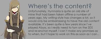 b a c k . c l e a r . f o r w a r d Hymnaria and its contents are © Samantha 2007-2020, however Tear and Tales of the Abyss are © NAMCO. Hymnaria is a part of AFTER-DEATH.ORG.
